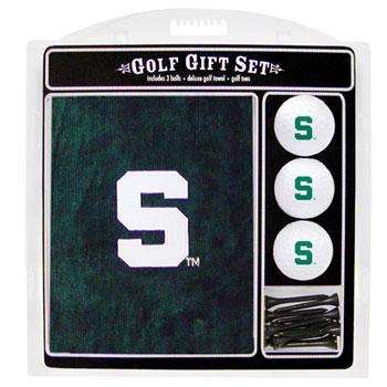 Each Michigan State Spartans logo embroidered golf gift set includes a 16" X 26" embroidered tri-fold Michigan State Spartans golf towel, 3 regulation Michigan State Spartans golf balls, and 12 golf tees.