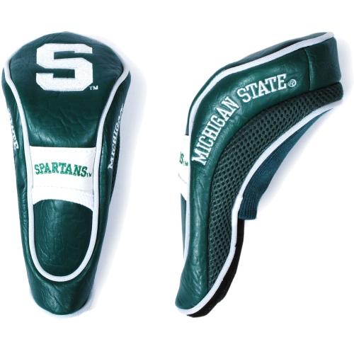 The Michigan State Spartans logo hybrid golf head cover is EZ on/EZ off and fits all hybrid, utility and even many fairway clubs. Imitation leather front and sides, with mesh and nylon back for easy stretching and Michigan State Spartans logos and trademarks embroidered on 4 locations of the hybrid headcover.