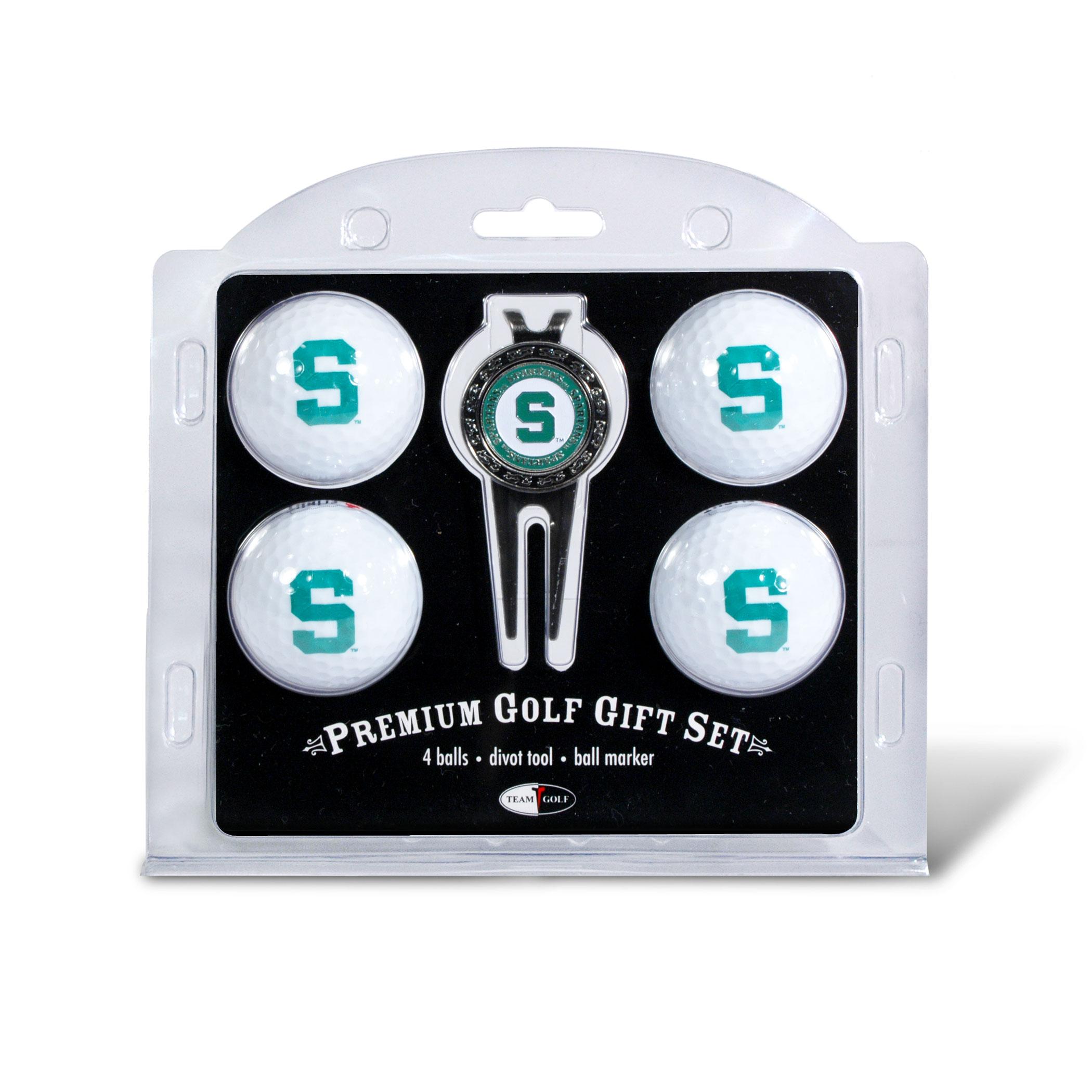 Michigan State Spartans logo 4 ball divot tool gift set contains 4 regulation imprinted golf balls, brass divot tool and 1 removable imprinted magnetic ball marker.