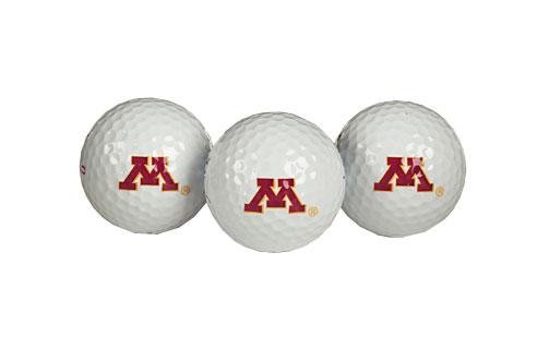 Three quality surlyn covered golf balls imprinted with the Minnesota Golden Gophers college logo.