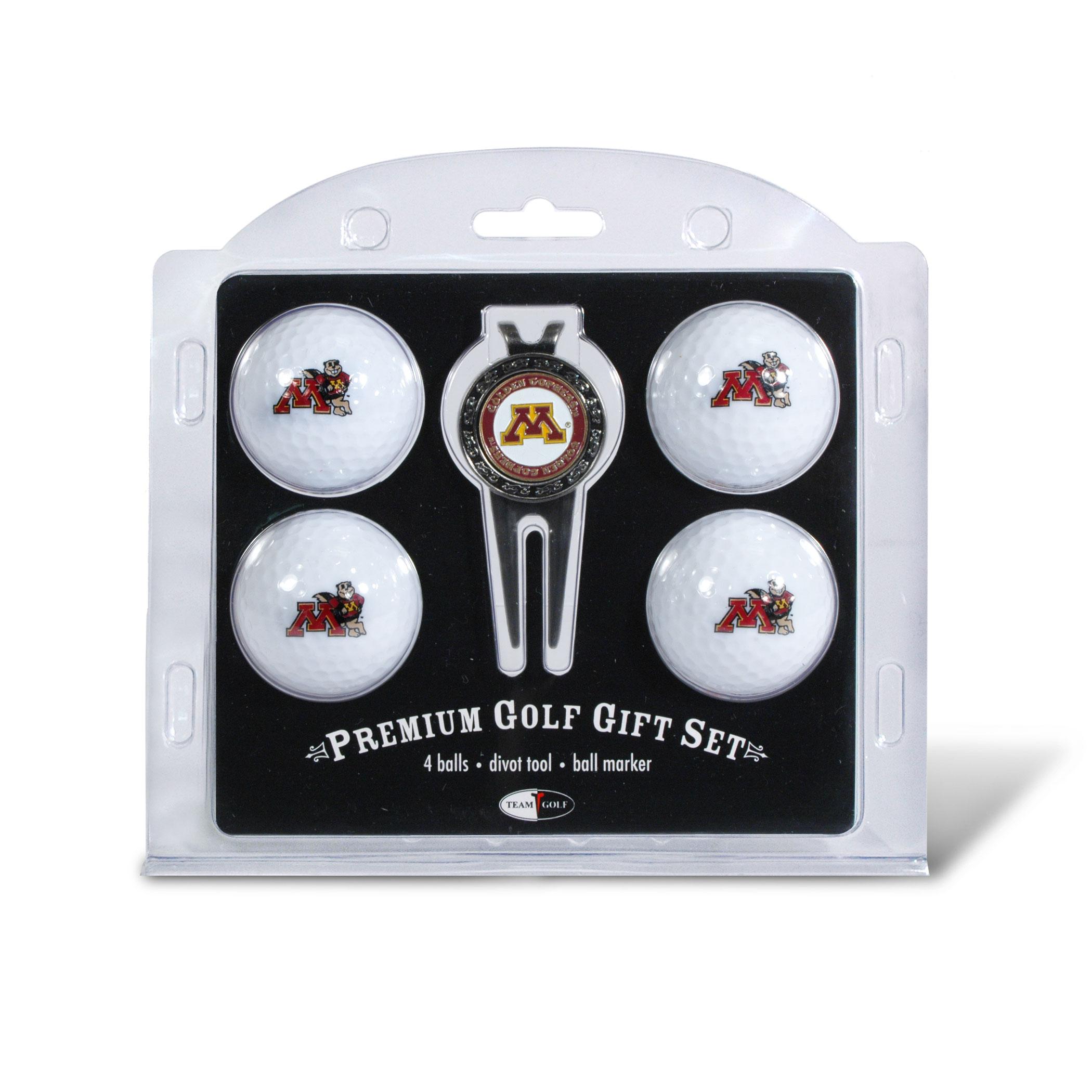 Minnesota Golden Gophers logo 4 ball divot tool gift set contains 4 regulation imprinted golf balls, brass divot tool and 1 removable imprinted magnetic ball marker.