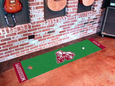 Practice your putting skills with this dual use Mississippi State Bulldogs logo runner. This realistic Mississippi State Bulldogs logo putting green runner acts as a putting practice surface as well as a runner with the Mississippi State Bulldogs color and logo. Looks good in your game room, office or any room you choose. Includes a secure fit plastic target barrier bumper under the Mississippi State Bulldogs logo mat that acts as a putting hole. Has a 11 on the Stimp meter, and it is made of a Chromojet-printed nylon surface with vinyl backing. Approximant measurements are 18” x 72", and it is officially licensed. Not available for expedited delivery. All mats are made to order therefore may take up to 2 weeks to ship.