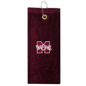 Premium weight 16" x 26" Mississippi State Bulldogs logo embroidered tri-fold golf towel made of sheared 100% cotton velour. Features a swivel clip attachment. Embroidered with the Mississippi State Bulldogs logo.