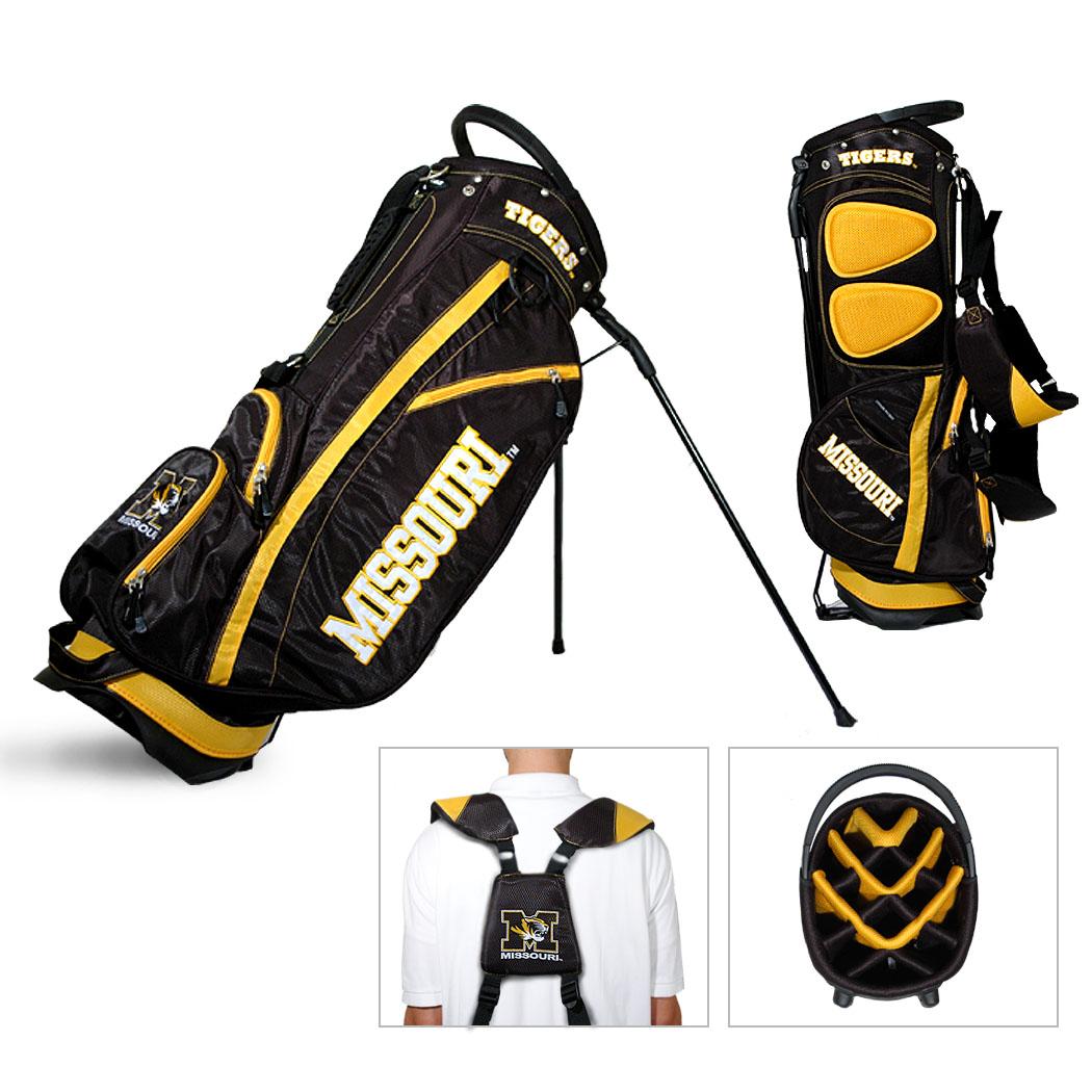 The Missouri Tigers Logo Golf Stand Bag is a lightweight golf stand bag, which includes 5 Missouri Tigers embroideries, 7-way full-length dividers, 6 zippered pockets, padded dual strap for easy carry, removable rain hood, umbrella holder, towel ring, velcro glove holder and easy-to-use stand system.