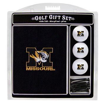 NCAA Golf Gift Set includes the following: (1)One Missouri Tigers logo 16" x 22" 100% cotton tri-folded embroidered towel with scrubber pattern, swivel clip for easy bag attachment and team logo embroidery; (2) 2 Missouri Tigers logo regulation golf balls with full color team logo durable imprint; and (3) One Missouri Tigers logo specific divot tool and removable double sided enamel color fill magnetic marker, all housed in sleek tin packaging