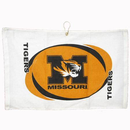 Standard weight 16" x 26" Missouri Tigers logo printed golf towel, made of durable 100% cotton. Features a center placement brass grommet and hook that allows for easy access and keeps towel off the ground. Printed with the Missouri Tigers trademark.