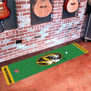 Practice your putting skills with this dual use Missouri Tigers logo runner. This realistic Missouri Tigers logo putting green runner acts as a putting practice surface as well as a runner with the Missouri Tigers color and logo. Looks good in your game room, office or any room you choose. Includes a secure fit plastic target barrier bumper under the Missouri Tigers logo mat that acts as a putting hole. Has a 11 on the Stimp meter, and it is made of a Chromojet-printed nylon surface with vinyl backing. Approximant measurements are 18” x 72", and it is officially licensed. Not available for expedited delivery. All mats are made to order therefore may take up to 2 weeks to ship.