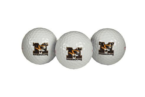 Three quality surlyn covered golf balls imprinted with the Missouri Tigers college logo.