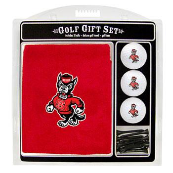 Each North Carolina State Wolf Pack logo embroidered golf gift set includes a 16" X 26" embroidered tri-fold North Carolina State Wolf Pack golf towel, 3 regulation North Carolina State Wolf Pack golf balls, and 12 golf tees.