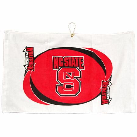 Standard weight 16" x 26" North Carolina State Wolf Pack logo printed golf towel, made of durable 100% cotton. Features a center placement brass grommet and hook that allows for easy access and keeps towel off the ground. Printed with the North Carolina State Wolf Pack trademark.