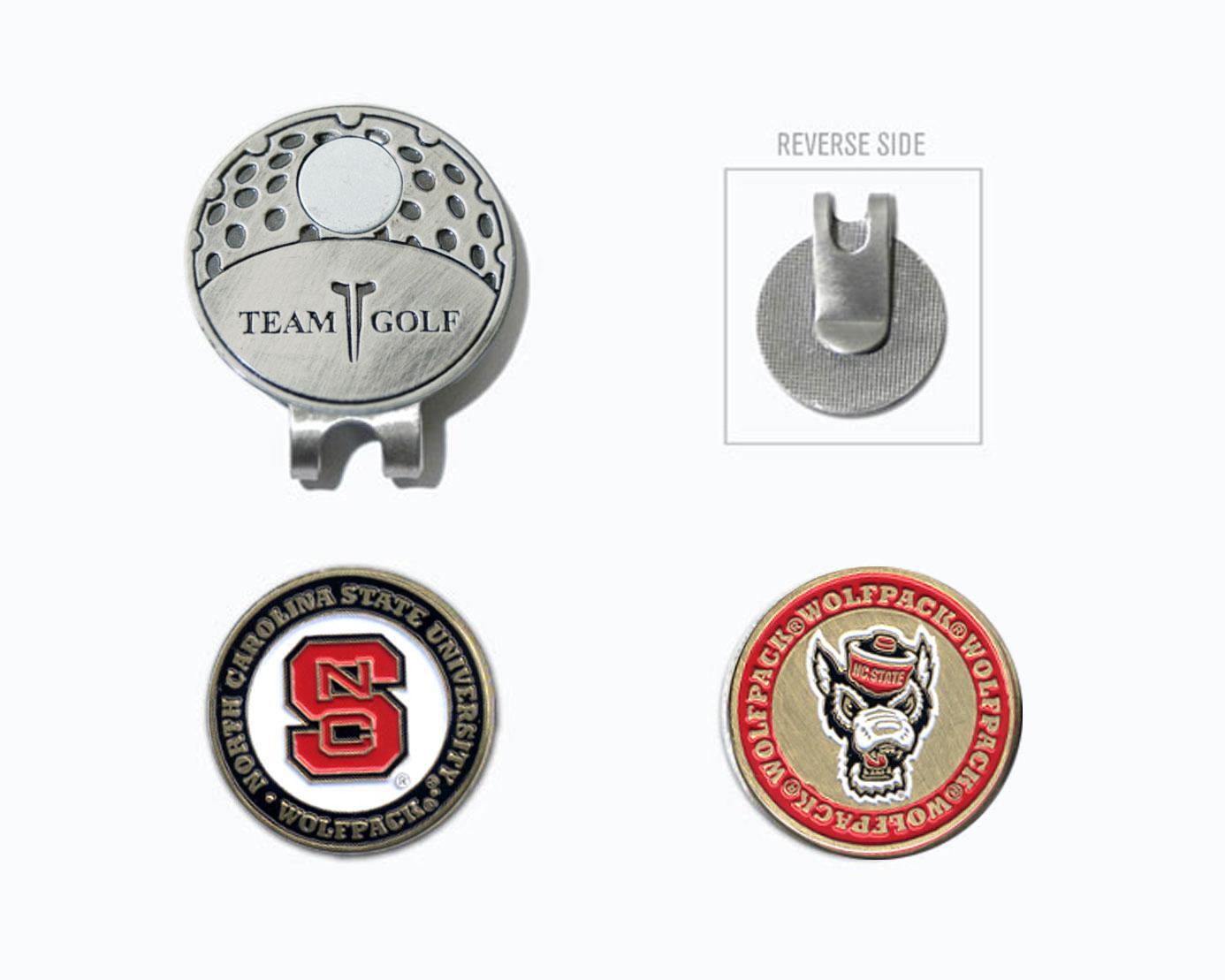 Large double-sided golf ball marker with the North Carolina State Wolf Pack logo that is magnetically held to the metal clip which fits over the brim of your hat.