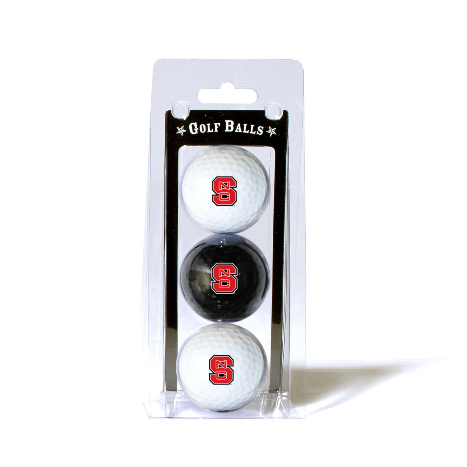 Three quality surlyn covered golf balls imprinted with the North Carolina State Wolf Pack college logo.