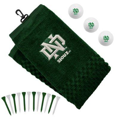 Each North Dakota Fighting Sioux logo embroidered golf gift set includes a 16" X 26" embroidered tri-fold North Dakota Fighting Sioux golf towel, 3 regulation North Dakota Fighting Sioux golf balls, and 12 golf tees.