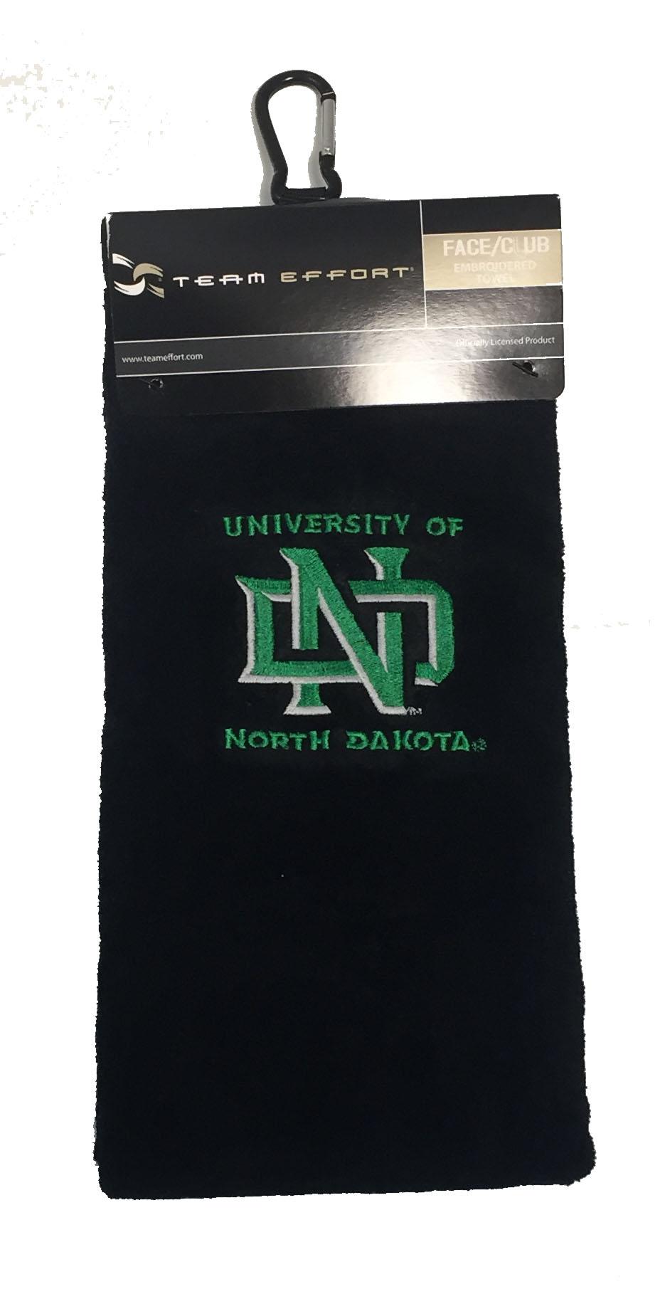 Premium weight 16" x 26" North Dakota Fighting Sioux logo embroidered tri-fold golf towel made of sheared 100% cotton velour. Features a swivel clip attachment. Embroidered with the North Dakota Fighting Sioux logo.