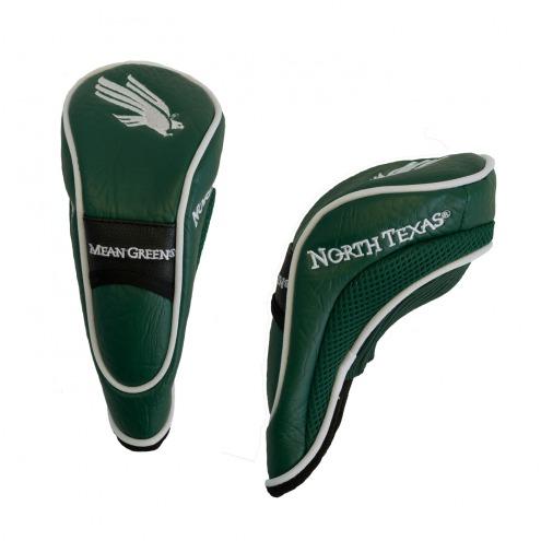 The North Texas Mean Green logo hybrid golf head cover is EZ on/EZ off and fits all hybrid, utility and even many fairway clubs. Imitation leather front and sides, with mesh and nylon back for easy stretching and North Texas Mean Green logos and trademarks embroidered on 4 locations of the hybrid headcover.