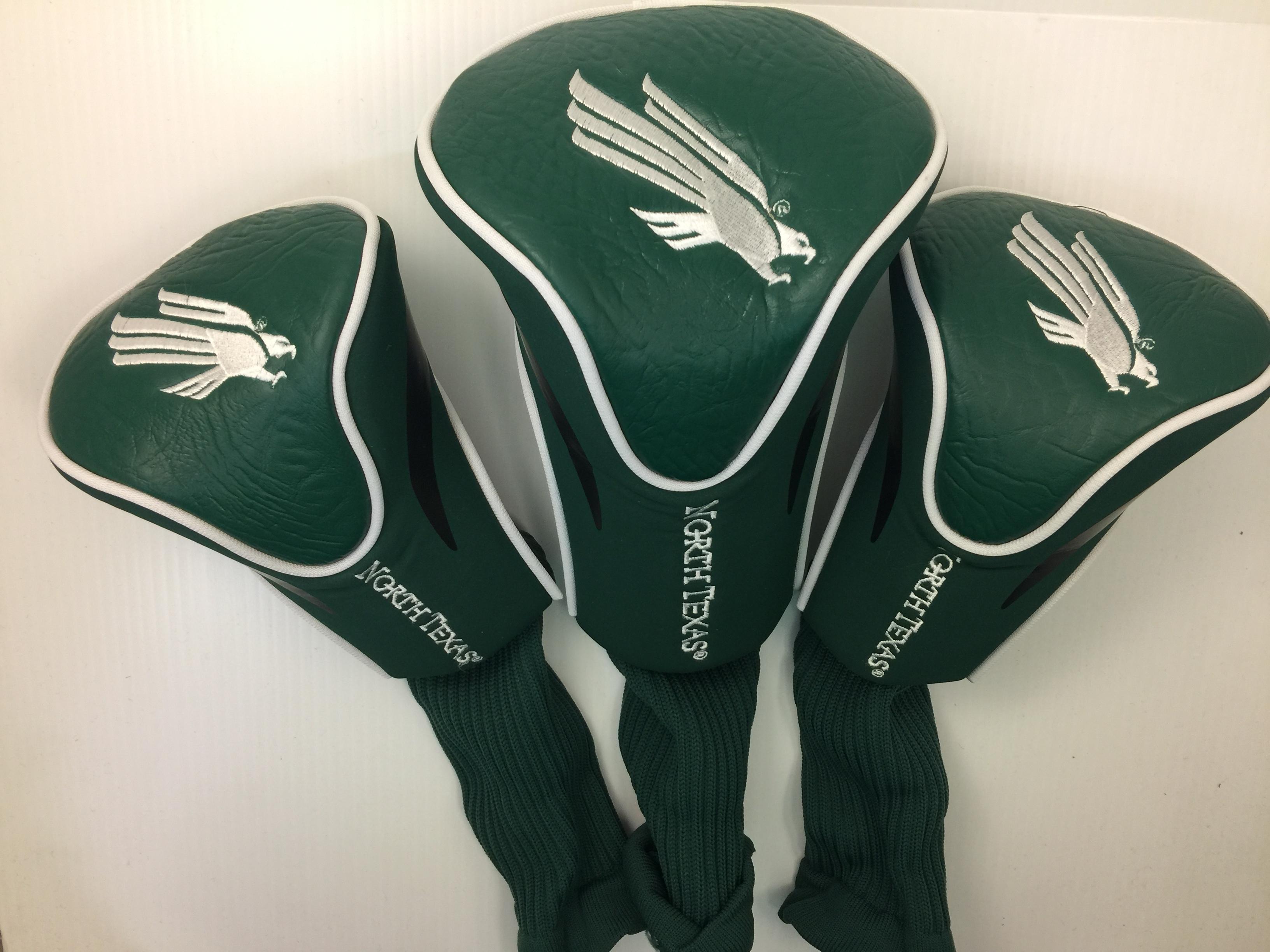 North Texas Mean Green Contour Fit Headcover Set. Take your team pride to the golf course with this North Texas Mean Green Contour Fit Headcover Set. Set includes 3 stylish contoured headcovers with innovative materials and sleek design - numbered 1, 3 and X. *The #1 fits all oversized drivers *Nylon sock protects shafts from damage *Officially licensed by the NCAA