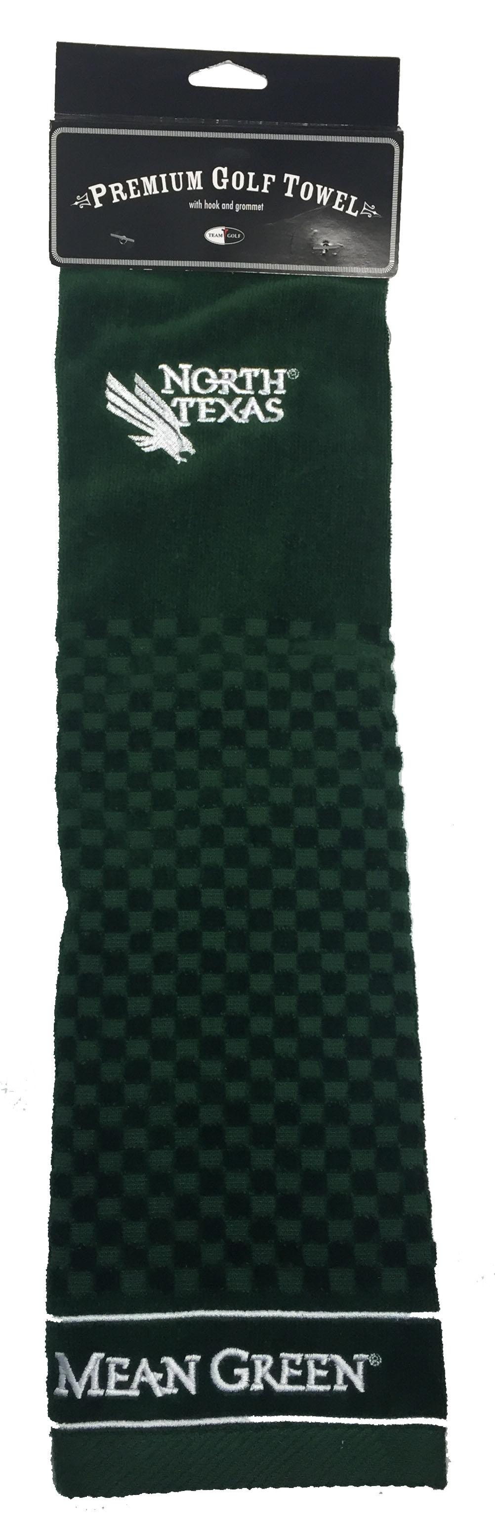 Premium weight 16" x 26" North Texas Mean Green logo embroidered tri-fold golf towel made of sheared 100% cotton velour. Features a swivel clip attachment. Embroidered with the North Texas Mean Green logo.