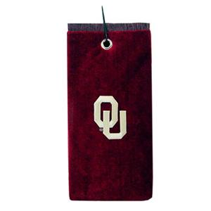 Premium weight 16" x 26" Oklahoma Sooners logo embroidered tri-fold golf towel made of sheared 100% cotton velour. Features a swivel clip attachment. Embroidered with the Oklahoma Sooners logo.