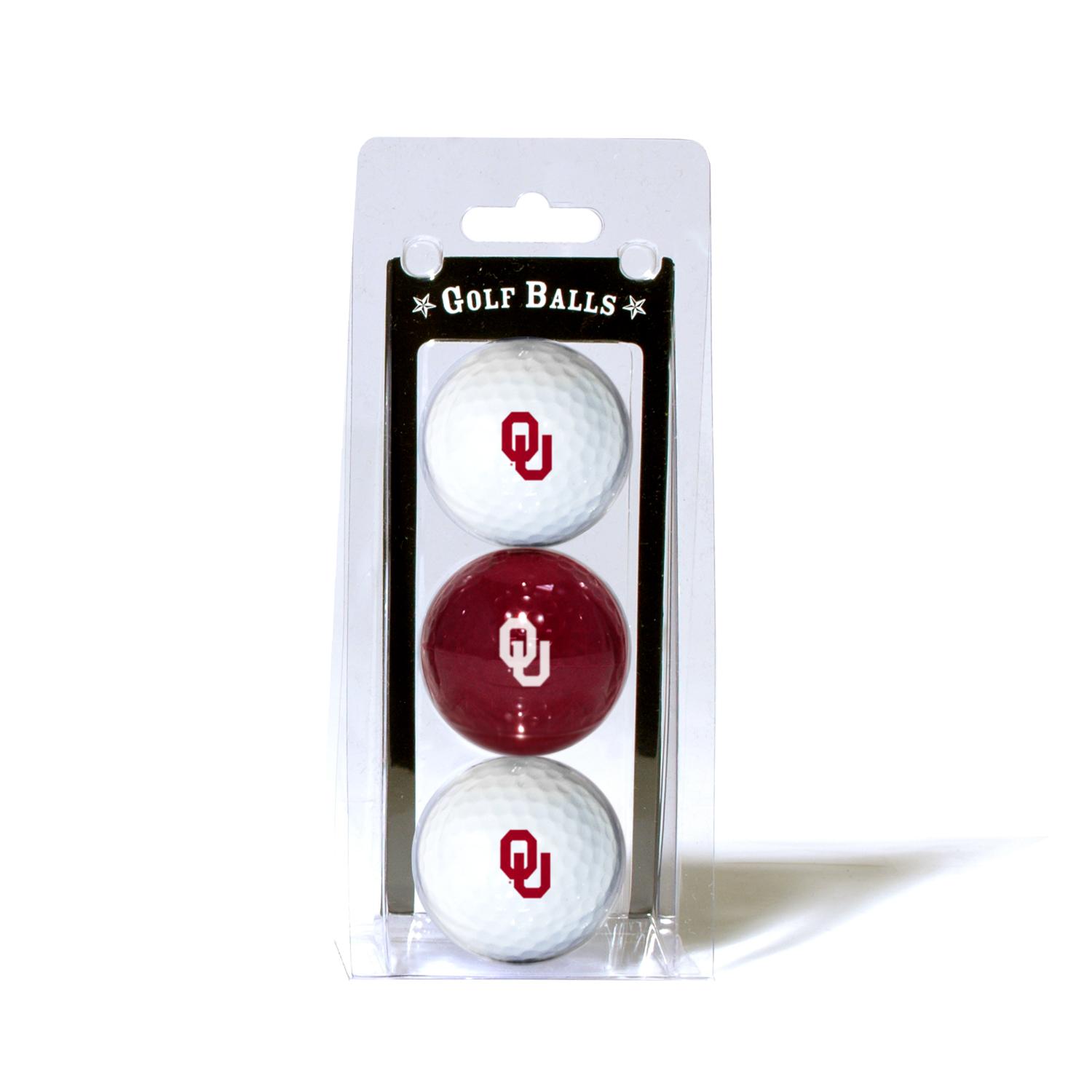 Three quality surlyn covered golf balls imprinted with the Oklahoma Sooners college logo.