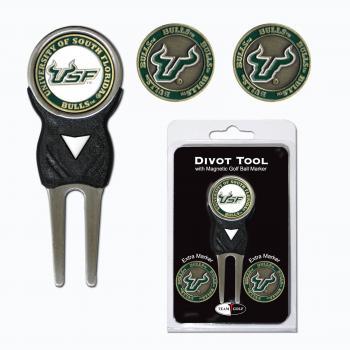 South Florida Bulls logo 4 ball divot tool gift set contains 4 regulation imprinted golf balls, brass divot tool and 1 removable imprinted magnetic ball marker.