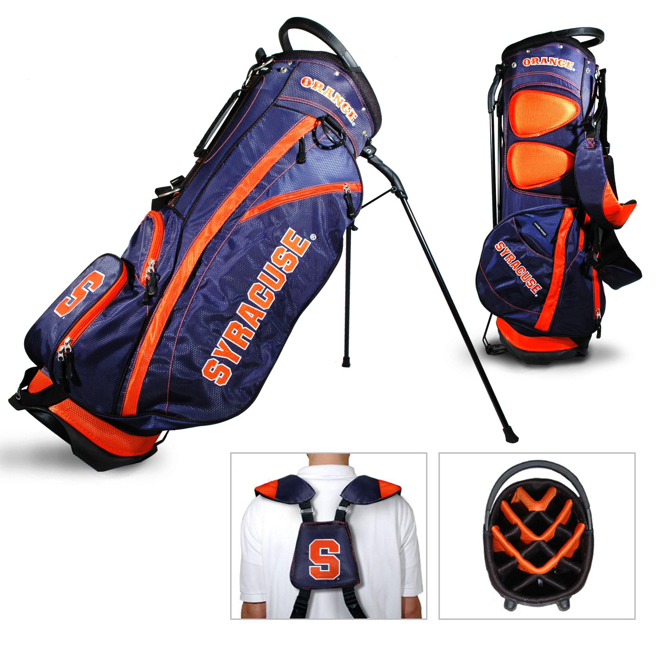 The Syracuse Orangemen Logo Golf Stand Bag is a lightweight golf stand bag, which includes 5 Syracuse Orangemen embroideries, 7-way full-length dividers, 6 zippered pockets, padded dual strap for easy carry, removable rain hood, umbrella holder, towel ring, velcro glove holder and easy-to-use stand system.