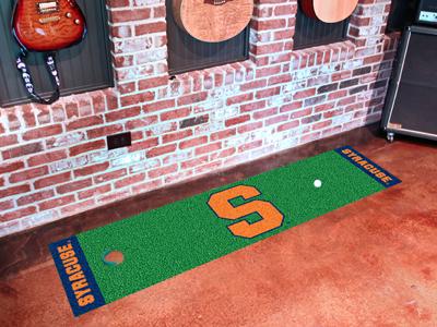 Practice your putting skills with this dual use Syracuse Orangemen logo runner. This realistic Syracuse Orangemen logo putting green runner acts as a putting practice surface as well as a runner with the Syracuse Orangemen color and logo. Looks good in your game room, office or any room you choose. Includes a secure fit plastic target barrier bumper under the Syracuse Orangemen logo mat that acts as a putting hole. Has a 11 on the Stimp meter, and it is made of a Chromojet-printed nylon surface with vinyl backing. Approximant measurements are 18” x 72", and it is officially licensed. Not available for expedited delivery. All mats are made to order therefore may take up to 2 weeks to ship.