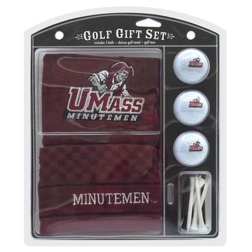 Each Massachusetts Minutemen logo embroidered golf gift set includes a 16" X 26" embroidered tri-fold Massachusetts Minutemen golf towel, 3 regulation Massachusetts Minutemen golf balls, and 12 golf tees.