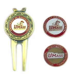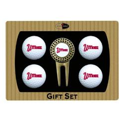Massachusetts Minutemen logo 4 ball divot tool gift set contains 4 regulation imprinted golf balls, brass divot tool and 1 removable imprinted magnetic ball marker.