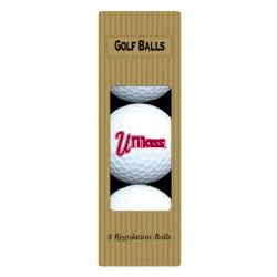 Three quality surlyn covered golf balls imprinted with the Massachusetts Minutemen college logo.