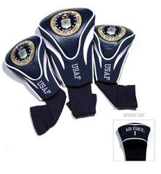 U.S. Air Force Contour Fit Headcover Set. Take your team pride to the golf course with this U.S. Air Force Contour Fit Headcover Set. Set includes 3 stylish contoured headcovers with innovative materials and sleek design - numbered 1, 3 and X. *The #1 fits all oversized drivers *Nylon sock protects shafts from damage *Officially licensed by the NCAA