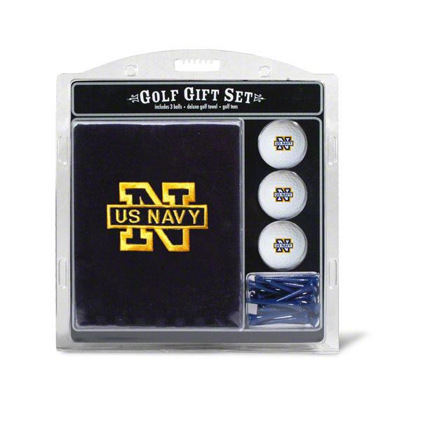 Each U.S. Navy logo embroidered golf gift set includes a 16" X 26" embroidered tri-fold U.S. Navy golf towel, 3 regulation U.S. Navy golf balls, and 12 golf tees.