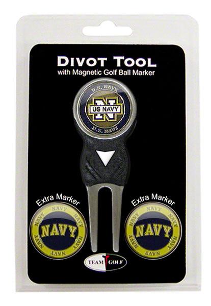 U.S. Navy logo golf divot repair tool is a vital component for every golfer's game. Heavy gauge metal construction that will provide years of use to repair divots, mark your ball, and clean turf from your cleats. The divot tool has a beautiful finish and is approximately 3" in length. The large ball marker is magnetically held to the U.S. Navy tool and includes 2 extra U.S. Navy logo golf ball markers.