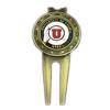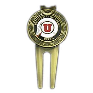 Utah Utes logo golf divot repair tool is a vital component for every golfer's game. Heavy gauge metal construction that will provide years of use to repair divots, mark your ball, and clean turf from your cleats. Top design of the Utah Utes logo divot repair tool is ideal for a club holder, and the integrated clip offers versatility, which can be used as a money clip or to hold the tool securely to your pocket or belt. Beautiful antique brass finish and approximately 3" in length. Large ball marker on the front that is magnetically held to tool with the Utah Utes logo and smaller marker on back of the Utah Utes logo divot repair tool that is magnetically held in place.