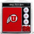 NCAA Golf Gift Set includes the following: (1)One Utah Utes logo 16" x 22" 100% cotton tri-folded embroidered towel with scrubber pattern, swivel clip for easy bag attachment and team logo embroidery; (2) 2 Utah Utes logo regulation golf balls with full color team logo durable imprint; and (3) One Utah Utes logo specific divot tool and removable double sided enamel color fill magnetic marker, all housed in sleek tin packaging