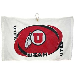 Standard weight 16" x 26" Utah Utes logo printed golf towel, made of durable 100% cotton. Features a center placement brass grommet and hook that allows for easy access and keeps towel off the ground. Printed with the Utah Utes trademark.