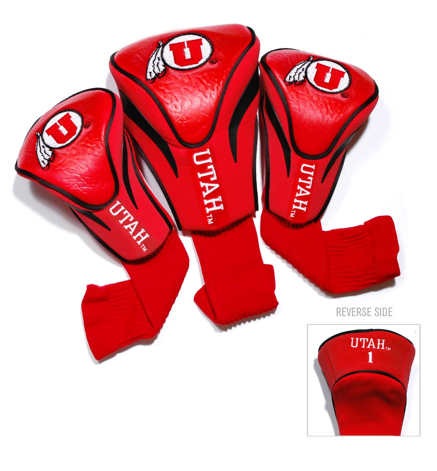 Utah Utes Contour Fit Headcover Set. Take your team pride to the golf course with this Utah Utes Contour Fit Headcover Set. Set includes 3 stylish contoured headcovers with innovative materials and sleek design - numbered 1, 3 and X. *The #1 fits all oversized drivers *Nylon sock protects shafts from damage *Officially licensed by the NCAA