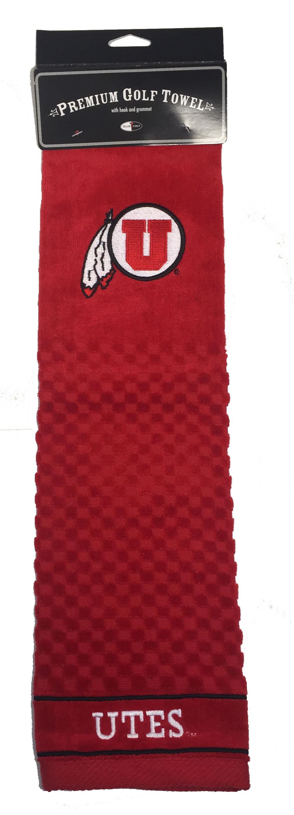 Each Utah Utes logo embroidered golf gift set includes a 16" X 26" embroidered tri-fold Utah Utes golf towel, 3 regulation Utah Utes golf balls, and 12 golf tees.