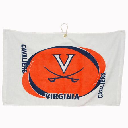 Standard weight 16" x 26" Virginia Cavaliers logo printed golf towel, made of durable 100% cotton. Features a center placement brass grommet and hook that allows for easy access and keeps towel off the ground. Printed with the Virginia Cavaliers trademark.