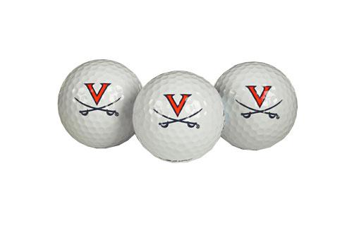 Three quality surlyn covered golf balls imprinted with the Virginia Cavaliers college logo.