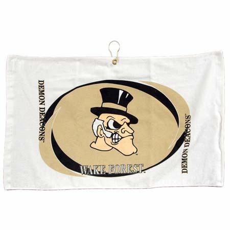 Standard weight 16" x 26" Wake Forest Demon Deacons logo printed golf towel, made of durable 100% cotton. Features a center placement brass grommet and hook that allows for easy access and keeps towel off the ground. Printed with the Wake Forest Demon Deacons trademark.