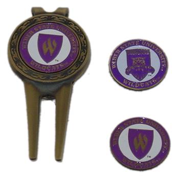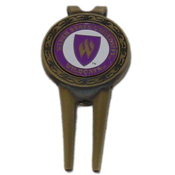 Weber State Wildcats logo golf divot repair tool is a vital component for every golfer's game. Heavy gauge metal construction that will provide years of use to repair divots, mark your ball, and clean turf from your cleats. Top design of the Weber State Wildcats logo divot repair tool is ideal for a club holder, and the integrated clip offers versatility, which can be used as a money clip or to hold the tool securely to your pocket or belt. Beautiful antique brass finish and approximately 3" in length. Large ball marker on the front that is magnetically held to tool with the Weber State Wildcats logo and smaller marker on back of the Weber State Wildcats logo divot repair tool that is magnetically held in place.