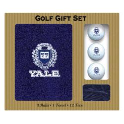 Each Yale Bulldogs logo embroidered golf gift set includes a 16" X 26" embroidered tri-fold Yale Bulldogs golf towel, 3 regulation Yale Bulldogs golf balls, and 12 golf tees.